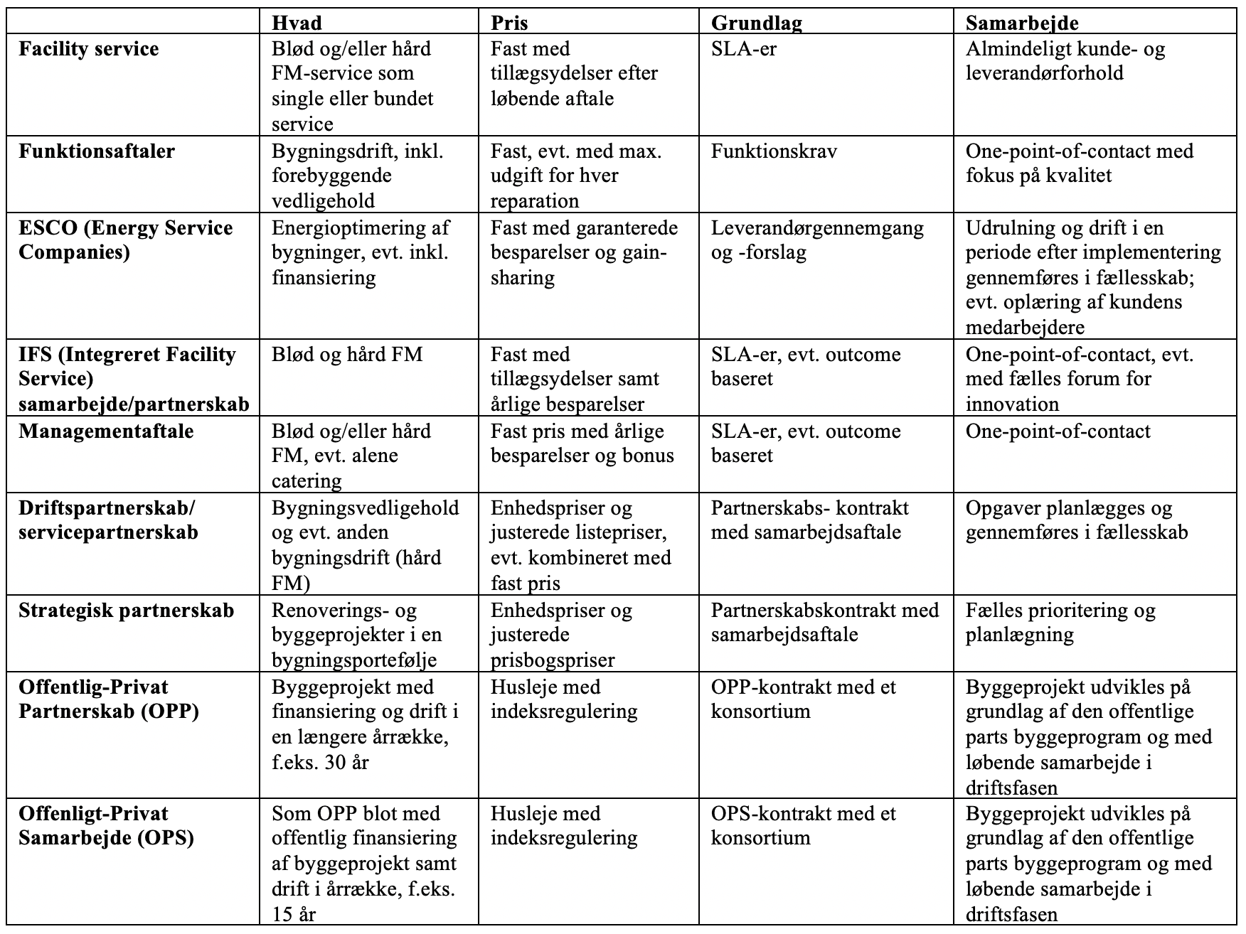 Der er over tid blevet udviklet en række forskellige typer af samarbejdsformer. I tabel 1 vises en oversigt over forskellige former for strategiske samarbejder og partnerskaber inden for FM, bygningsrenovering og byggeri. I det følgende omtales disse kort.