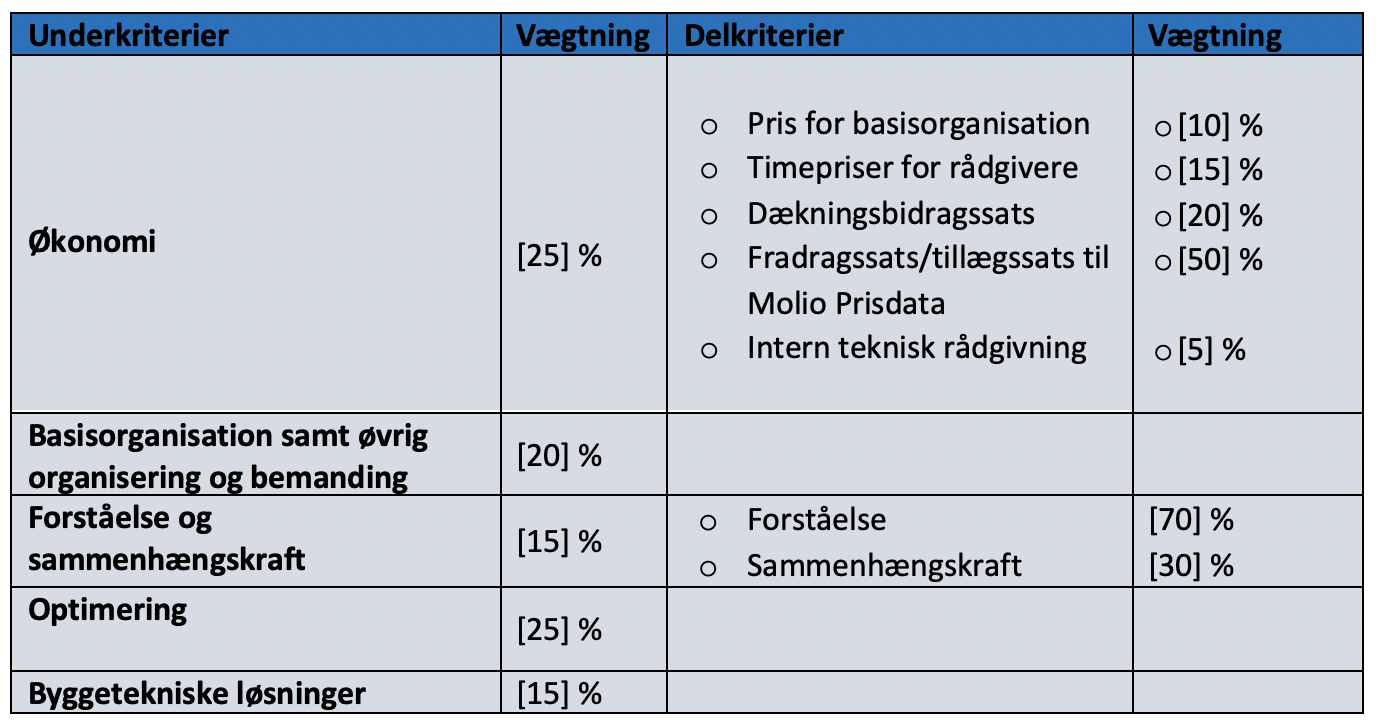 Tabel 2: Eksempel på underkriterier, delkriterier og vægtning