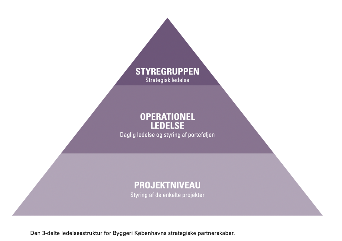 Ved opstart etableres normalt et projektkontor. Det kan enten være bygherre, der etableret projektkontoret, eller det kan være leveranceteamet. Projektkontoret kan være placeret ved bygherren eller der kan være arbejdspladser til brug for repræsentanter fra bygherren i projektkontoret. For at sikre den nødvendige ledelsesmæssige opmærksomhed og beslutningskraft ved bygherrens og leveranceteamets fælles organisering på strategisk, taktisk og operationelt niveau etableres der ved strategiske partnerskabet en 3-delt ledelsesstruktur. Den 3-delte struktur omfatter en styregruppe, operationel ledelse og projektledelse. Figur 1 illustrerer dette.