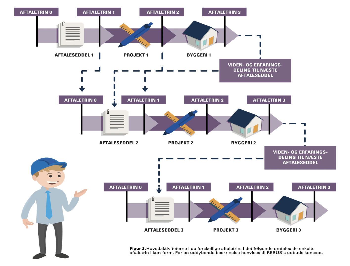 Figur 2 viser hvordan de forskellige aftaletrin indgår i processen bag et strategisk partnerskab. Aftaletrin 0 afregnes ikke særligt, idet leveranceteamets arbejde skal være indeholdt i deres tilbud. Aftaletrin 1 og 2 afregnes som honorar efter medgået tid i henhold til timesatser i tilbud, inkl. entreprenørens involvering. I aftaletrin 2 indgås endelig aftale til en fast pris for aftaletrin 3, evt. med risikopuljer.
