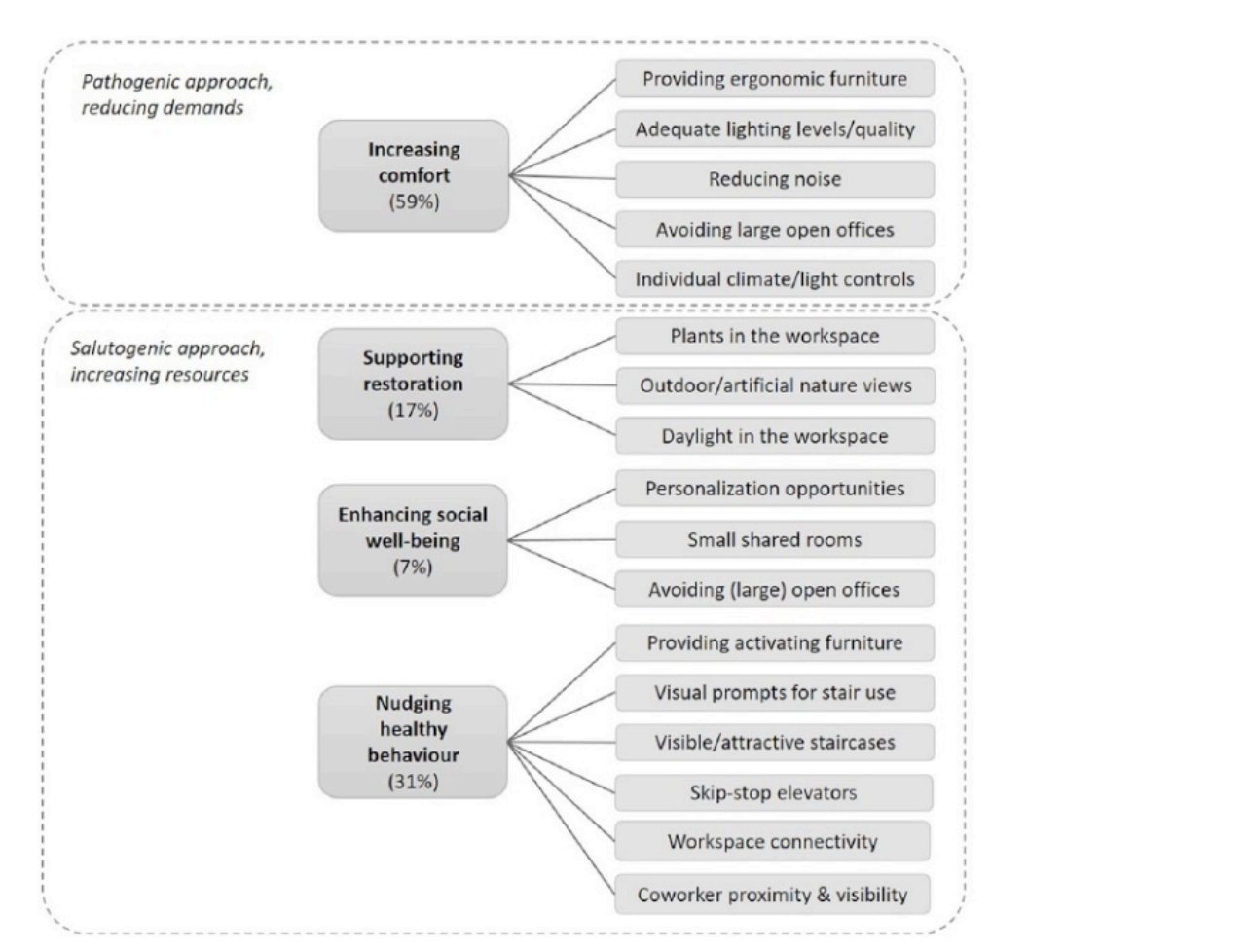 I Figur 2 er den salutogenetiske tilgang kendetegnet ved at sigte mod at øge medarbejdernes ressourcer, mens den patogenetiske approach sigter mod at reducere krav. Den patogenetisk tilgang omfatter en strategi med Øgning af komfort, som fokuserer på at reducere eller forebygge sundhedsklager, manglende komfort og stress. Den salutogenetiske tilgang omfatter tre forskellige strategier: Support af genopretning/restituering (’restoration’), Forbedre social trivsel og Nudging af sund adfærd. Strategierne med den salutogenetiske tilgang sigter mod at fremme sundhed ved at øge medarbejdernes ressourcer til at håndtere krav gennem positivt design.